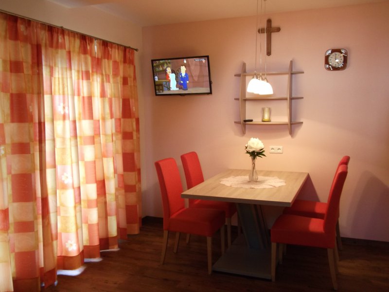 Die große, gemütliche Wohnküche ist komplett eingerichtet, E-Herd mit Backrohr, Kühlschrank mit Gefrierfach, Geschirrspülmaschine, Kaffeemaschine, Wasserkocher, Toaster, Eierkocher, ausreichendes Geschirr, ausziehbares Sofa, Sat-TV und Radio. 2 Doppelzimmer, jedes mit eigener Dusche und WC. Föhn, Bettwäsche, Handtücher, Tischwäsche und Geschirrtücher stellen wir Ihnen ausreichend zur Verfügung. Selbstverständlich ist auch ein Parkplatz am Haus. Wir würden uns freuen, Sie in unserem Haus bei einem Begrüßungsgetränk ´willkommen zu heißen.