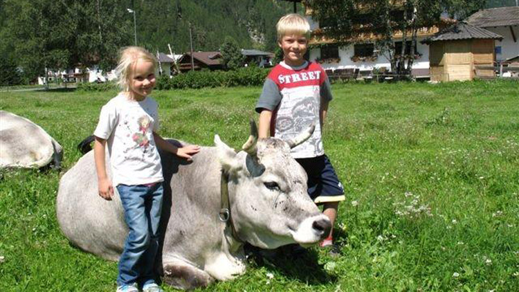 Das ist unser Holzhaus mit Rutsche und Sandkiste. Daneben steht eine Schaukel mit der man hoch in die Lüfte schweben kann. Nun das Wichtigste, das sind unsere Streicheltiere: Hofhund Cira, unsere Katzen Rocki und Minka sowie Kaninchen und Kälber. Da sind aber auch noch unsere zwei Ponys Max und Luna, sie tragen die kleinen Reiter gerne auf ihren Rücken um die Koppel.
