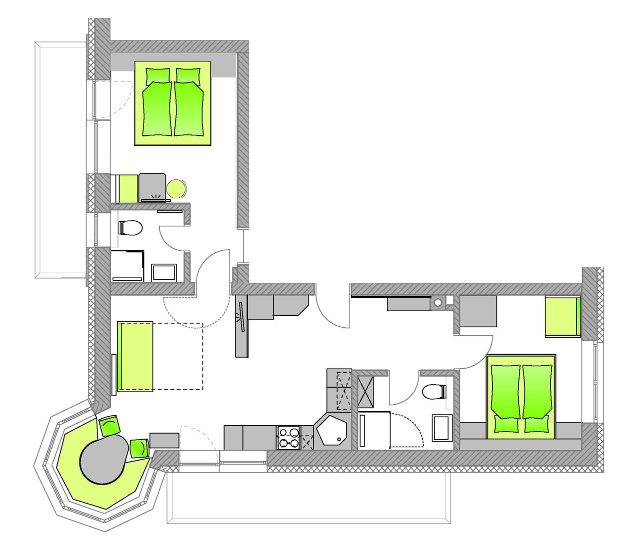 Unser modern gestaltetes Appartement bietet Platz für bis zu sechs Personen und verfügt über eine voll ausgestattete Küche, ein gemütliches Wohnzimmer sowie wahlweise ein oder zwei Schlafzimmer. Genießen Sie von Ihrem eigenen Balkon aus den atemberaubenden Blick auf die umliegende Berglandschaft.